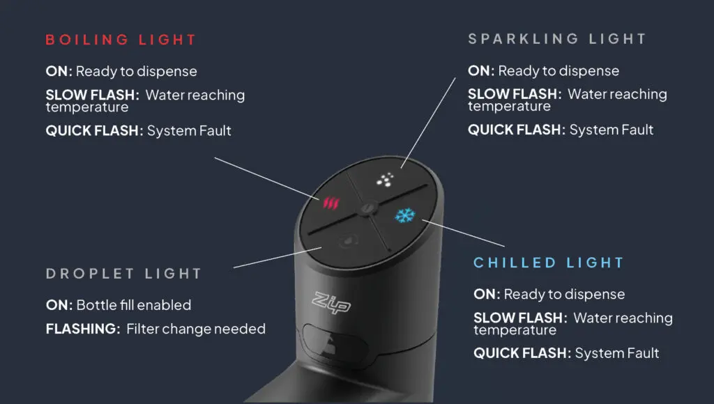 Flashing blue light means the chilled water hasn’t dropped to the desired temperature yet. Wait for the light to stop flashing before dispensing water, this can typically occur after switch on or after high volume usage.